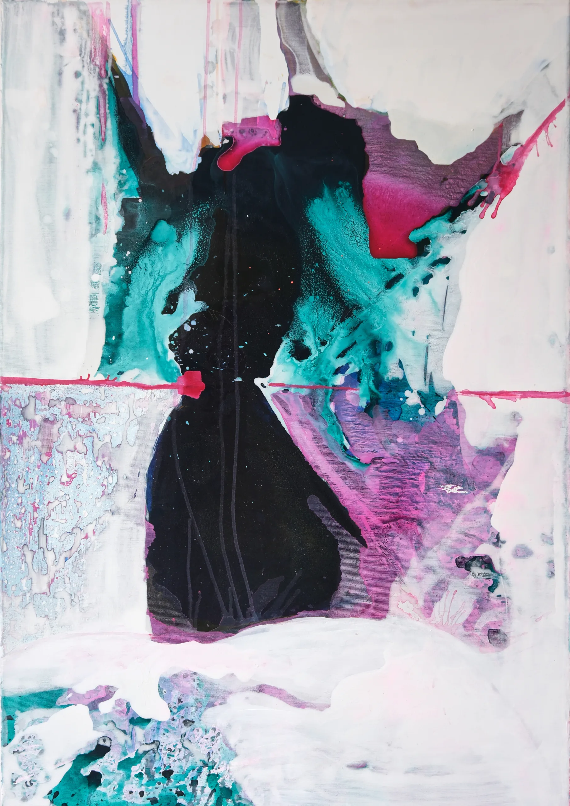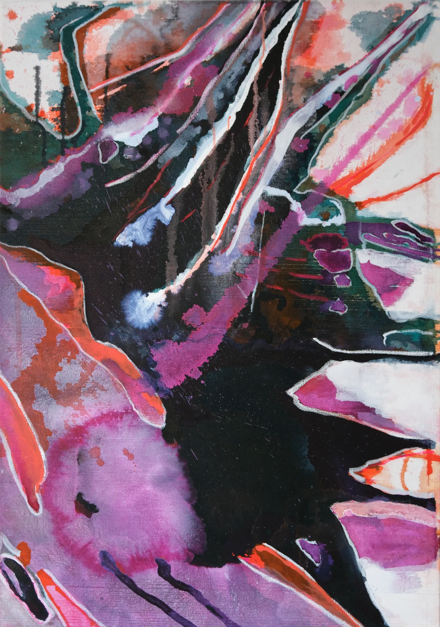 Untertage, 2024, Tusche, Acrly, Acryllack und Ölkreide auf Leinwand, 100 x 70 cm